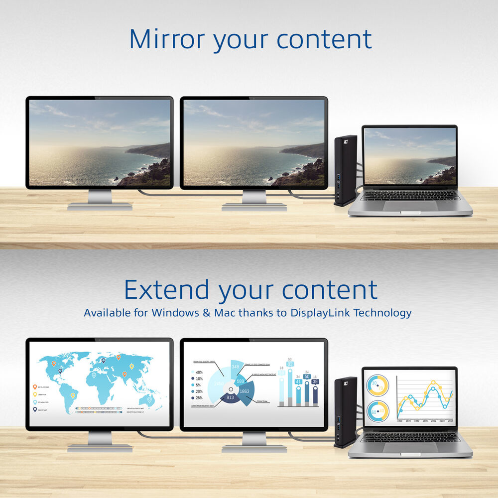 • Осигурява разширен десктоп с до 3 общи дисплея (1 лаптоп + 2 монитора).