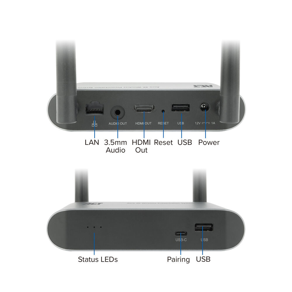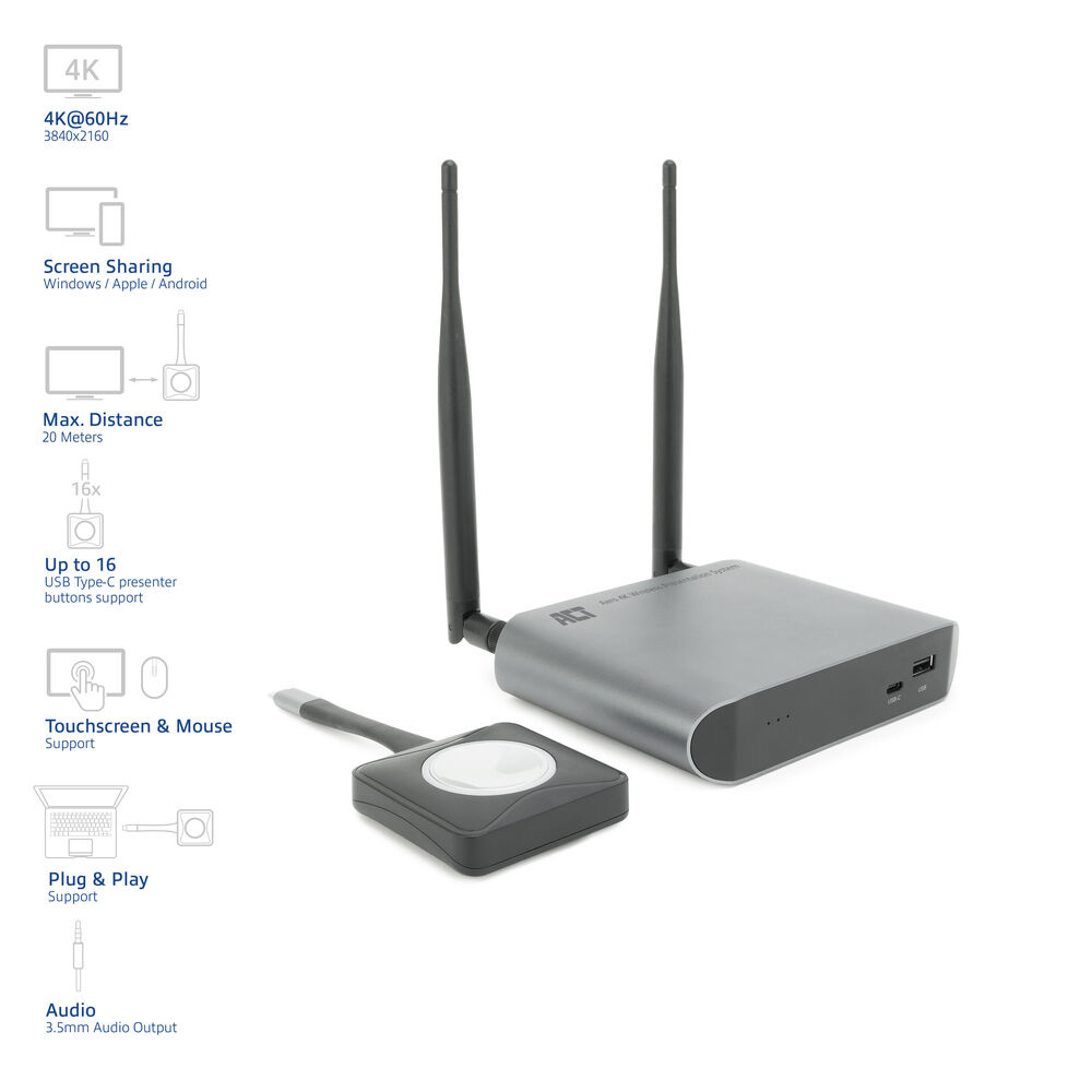 ACT Aero 4K Wireless Presentation System (AC7960) е интуитивно и надеждно решение за безжично споделяне на съдържание по време на присъствени срещи. Системата позволява бързо и лесно представяне на екран с едно натискане на бутон, без нужда от инсталиране на софтуер или конфигуриране на мрежи. Комплектът включва базова станция и един USB Type-C® презентатор бутон, което го прави готово стартово решение за конферентни зали, учебни зали и бизнес среди. Свържете бутона към лаптоп, таблет или смартфон и споделете съдържанието си безжично в 4K резолюция към HDMI дисплей. Aero е създаден за многопотребителска колаборация, като поддържа до 16 презентатор бутона едновременно. Функцията split-screen позволява едновременно показване на съдържание от двама презентатори върху един екран. Системата поддържа screen casting за Apple, Android и Windows, както и touch screen и mouse input за още по-интерактивни презентации.