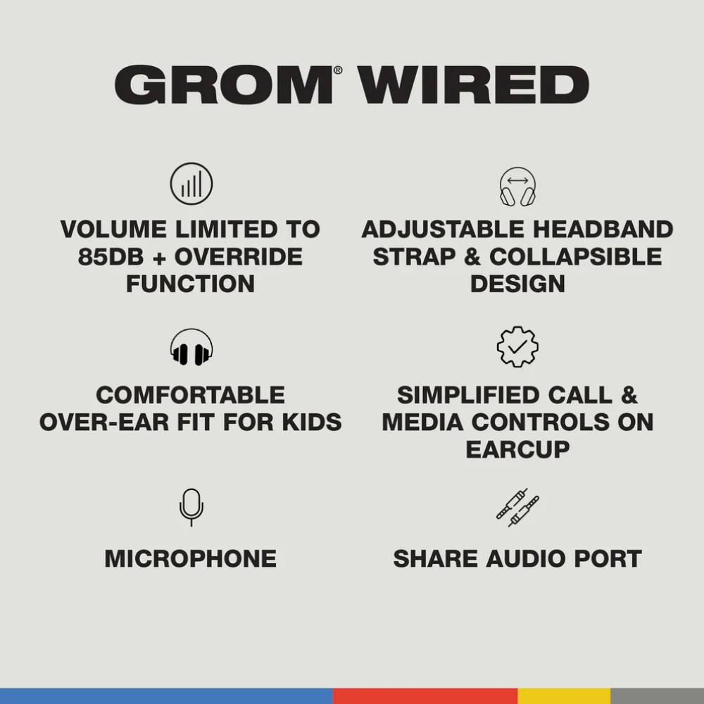 Skullcandy Grom са създадени специално за деца – с удобен, сгъваем дизайн, лесни за използване бутони и регулируема лента за глава, която се адаптира към всяка възраст. Слушалките осигуряват безопасно и качествено аудио изживяване, което ще направи всяко пътуване или домашно занимание по-забавно.