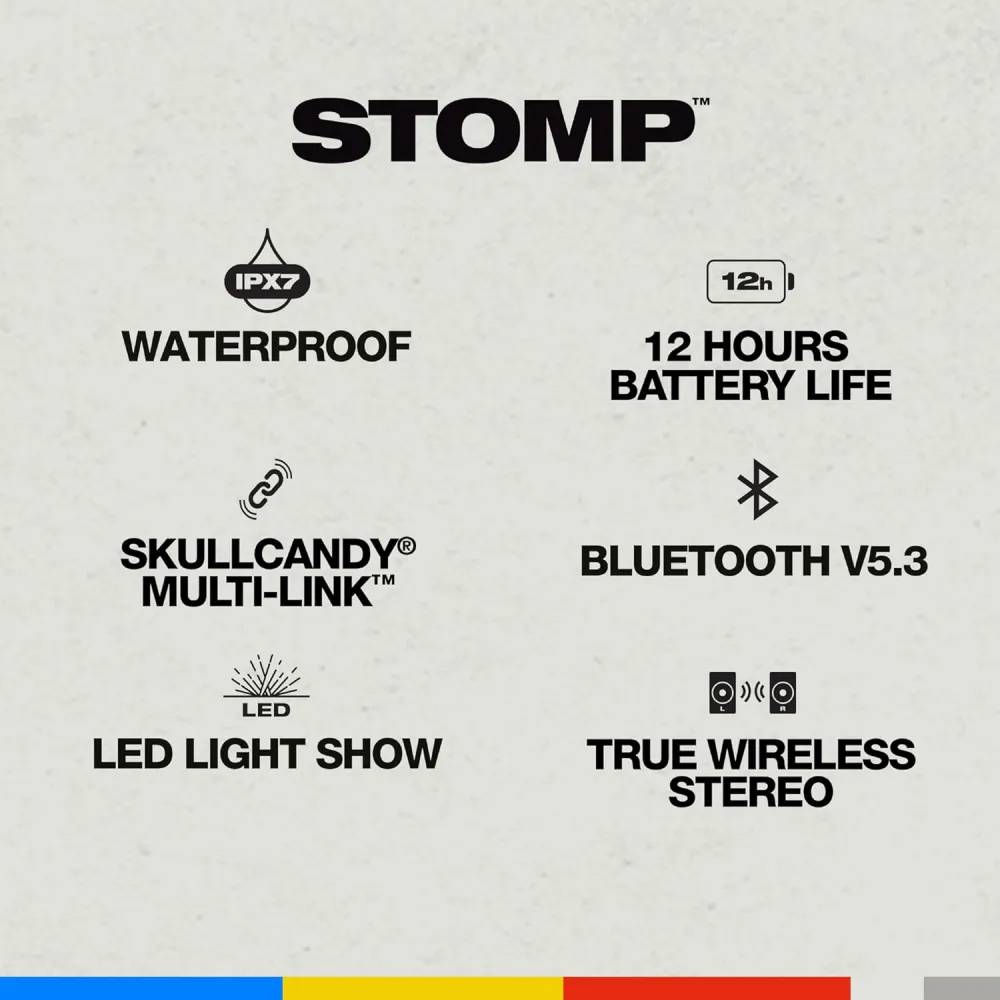 Преносимата Bluetooth парти колона Skullcandy Stomp Boombox е създадена за истински забавни моменти, с лесно пренасяне благодарение на интегрираната дръжка и възможност за зареждане на други устройства чрез USB портовете. С до 12 часа живот на батерията и мощни говорители с Woofer 5.25” и Tweeter 2.25”, колоната доставя дълбоки баси и ясен звук. LED светлинното шоу синхронизира динамично с ритъма на музиката, а IPX7 водоустойчивостта я прави идеална за плаж, басейн или партита на открито. Функциите True Wireless Stereo (TWS) и Multi-Link позволяват свързване на няколко колони за максимално покритие на звука.