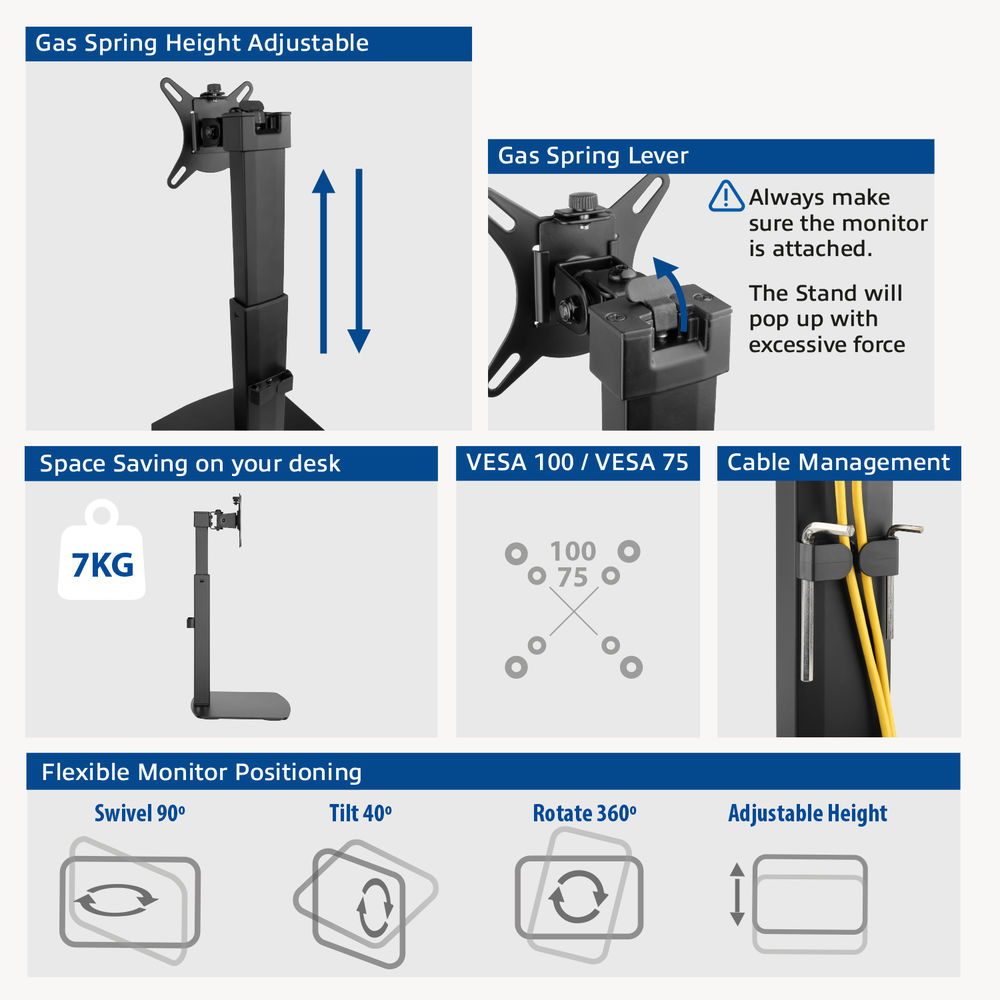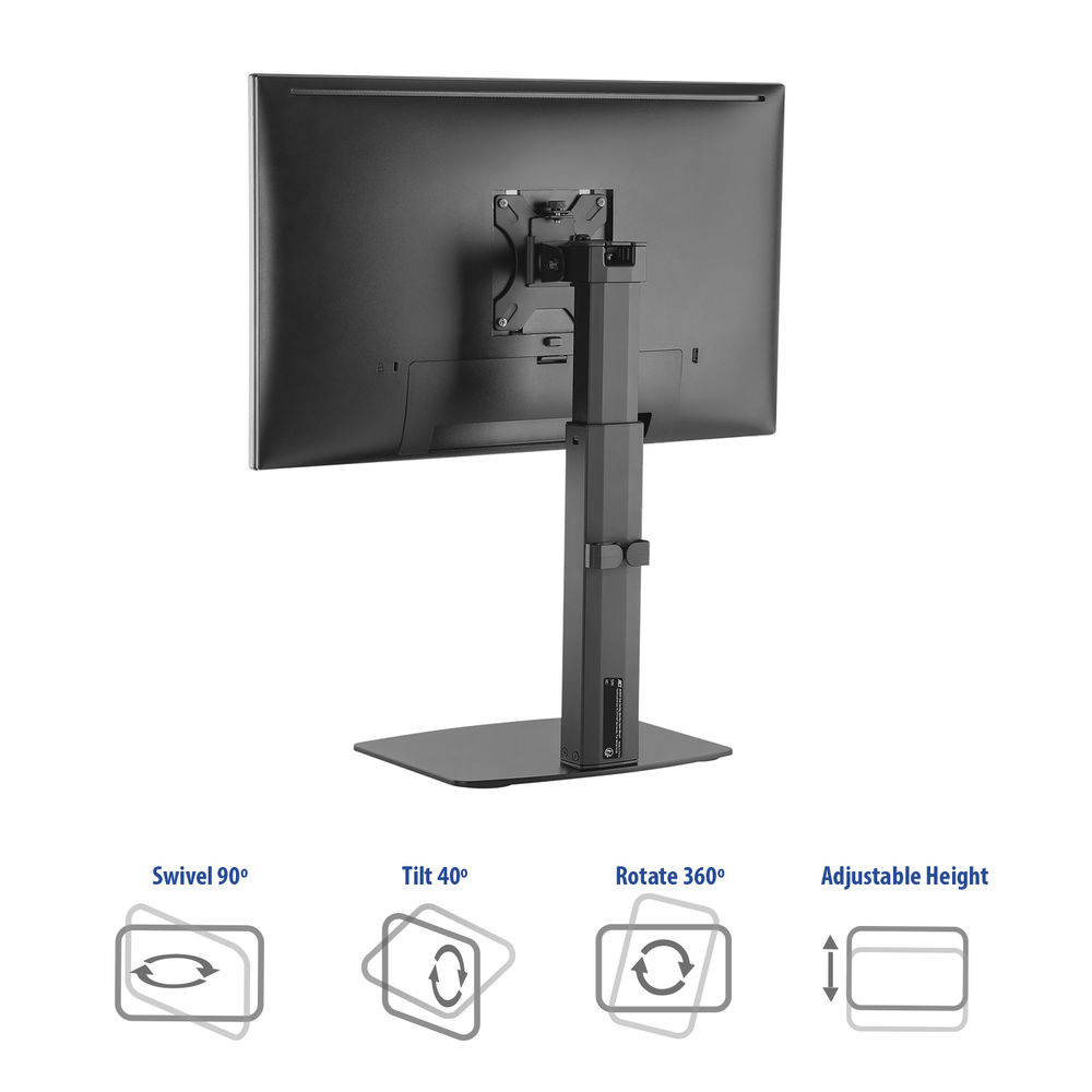 Настолната стойка за монитор ACT Office създава ергономично и подредено работно пространство. Поставя се директно върху бюрото и поддържа един монитор с размер до 32" и тегло до 7 кг. Газовата пружина позволява лесно регулиране на височината чрез удобна заключваща ръчка, без необходимост от инструменти. Подходяща е за динамични и гъвкави работни пространства. Благодарение възмоьността за регулиране на наклона и завъртането можете лесно да позиционирате екрана според вашите предпочитания. Вградена система за кабелно управление допринася за по-изчистен вид.